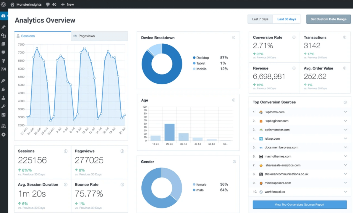 MonsterInsights, WordPress sitenizdeki Google Analytics web sitesi izleme hizmetlerini kolayca eklemenize, özelleştirmenize ve yönetmenize olanak tanıyan bir eklentidir. Özetle, web sitenizi Google Analytics ile izlemeyi kolaylaştırır.