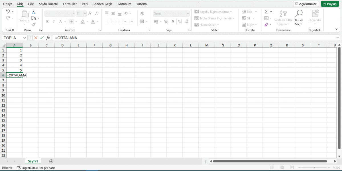 Boş bir hücre seçin ve “=ORTALAMA” yazıp çift tıklayarak ya da TAB tuşuyla seçin. İşlem yapmak istediğiniz hücre aralığını “:” kullanarak ya da direkt mouse ile aralık seçin. Seçmek istediğiniz özel hücreler varsa da “;” kullanın.
