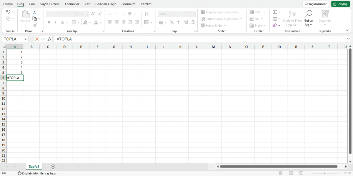 Sonucu görmek istediğiniz hücrenin içine “=TOPLA” ya da “=SUM” yazıp çift tıklayarak veya TAB tuşuyla seçerek toplama işlemi yapmak istediğiniz hücreleri seçebilirsiniz. Hücre aralığında işlem yapmak istiyorsanız “:” belirli hücrelerde toplama yapmak için de “;” kullanmalısınız. Toplama işlemini farklı yollarla da yapabilirsiniz. Örneğin “=A5+B3+C8” gibi. + yerine “-” çıkarma, “/” bölme ve “*” kullanarak da çarpma işlemi yapabilirsiniz.