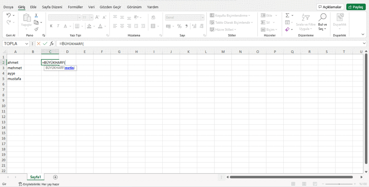 Bu formüller hücredeki harflerin büyük ya da küçük yapılması için kullanılır. Aşağıdaki örnekten yola çıkarak A2 hücresindeki ahmet yazısını =BÜYÜKHARF(A2) formülü ile AHMET olarak düzenleyebiliriz. =KÜÇÜKHARF formülü de büyük harfli içeriği küçük harfe dönüştürür.