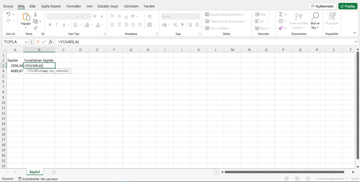 =YUVARLA bir sayıyı yakın olduğu sayıya yuvarlar. =YUVARLA yazıp yuvarlanmak istenen hücre seçilip “;” konulur. Devamında da yuvarlanmasını istenen basamak yazılır. A3 hücresindeki 2356,34 sayısı =YUVARLA(A3;0) formülüyle 2356’ya yuvarlanır.