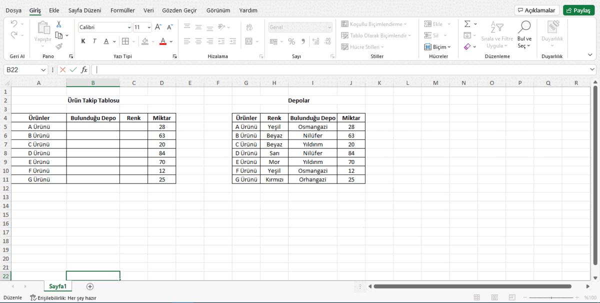 Aşağıdaki örnekte ürün takip tablosuna diğer tablodaki depo ve renk bilgilerini =DÜŞEYARA formülüyle nasıl alabileceğinizi açıklayalım;