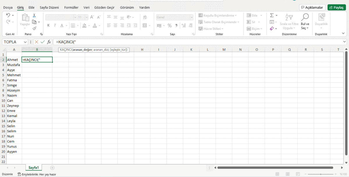 Belirli bir ifadenin seçilen aralıkta kaçıncı olduğunu bulmak için kullanılır. =KAÇINCI(aranan değer; aranan dizin; 0) şeklinde bir formül yapısına sahiptir. Aşağıdaki örnekteki şekilde formül oluşturarak Zeynep’in kaçıncı sırada formül ile bulabilirsiniz.